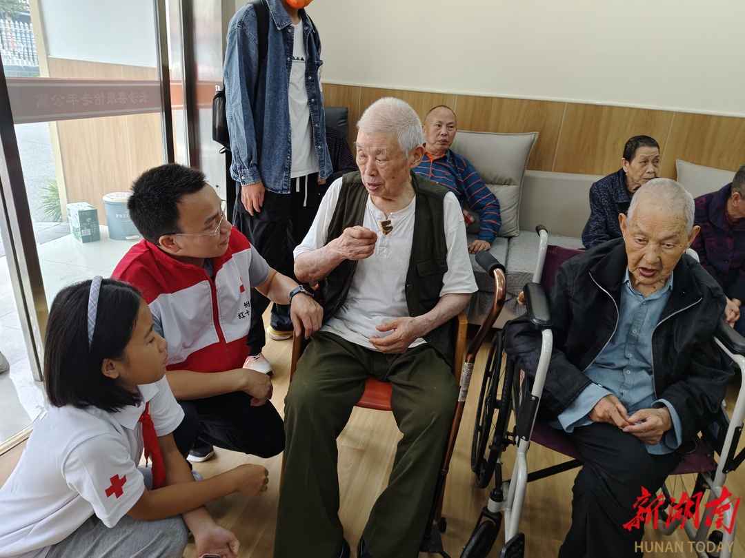 随后,志愿者们来到长沙县康怡敬老院。此时,敬老院的老人们早已在院子里坐好,看到红十字志愿者们忙碌的身影,纷纷起身迎接。志愿者们分工协作,有的将月饼逐一分发到每位老人手中、有的陪老人聊聊家常、有的询问老人生活情况、有的为行动不便的老人推动轮椅,志愿者们与老人们围坐在一起,倾听老人们的心声,了解敬老院的日常照料情况,还为老人们唱着一首首红色歌曲,一起为祖国庆祝华诞。
