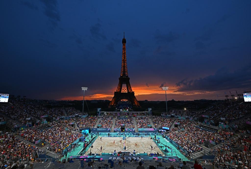 2024年7月31日,观众们在埃菲尔铁塔下观看巴黎奥运会沙滩排球比赛。新华社记者 李尕 摄