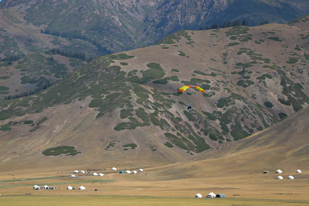 7月17日,游客在赛里木湖景区体验电动滑翔伞。新华社记者 王婧嫱 摄