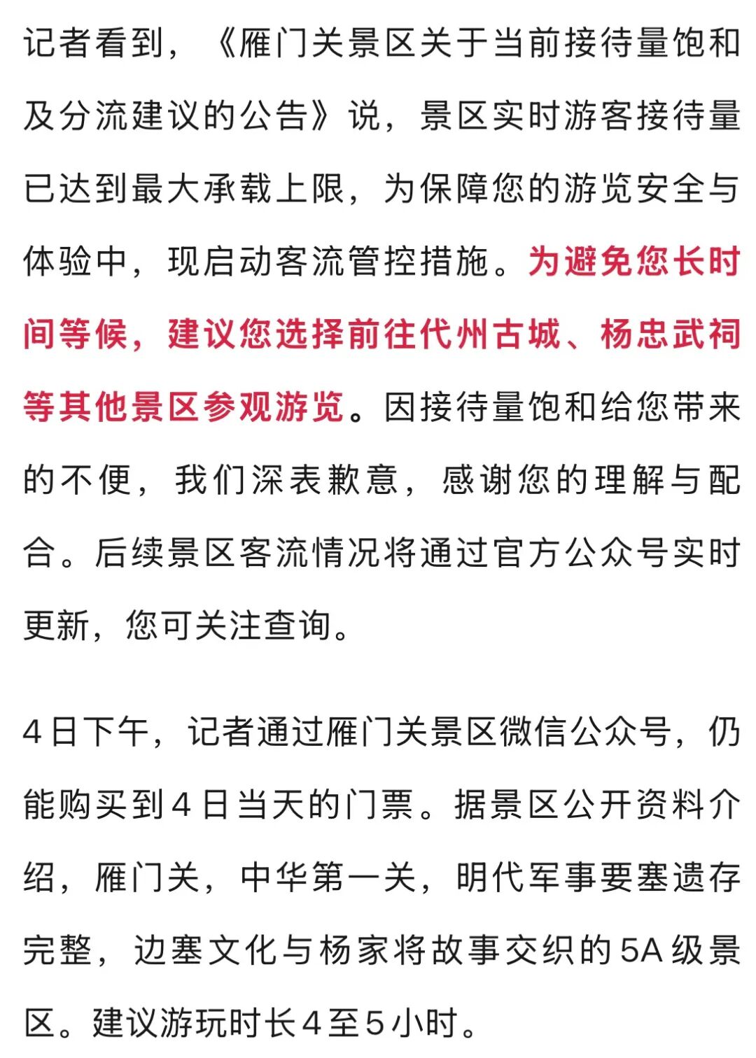 4日下午3时许,雁门关景区工作人员介绍,昨天喊退票的是南门那边的游客,之前没想到南门那边也会有那么多的人,司机都不敢开车门,一开车门就全都涌上去了。今天已经紧急加调了20多辆车,还派出了60多人到那边维持秩序。