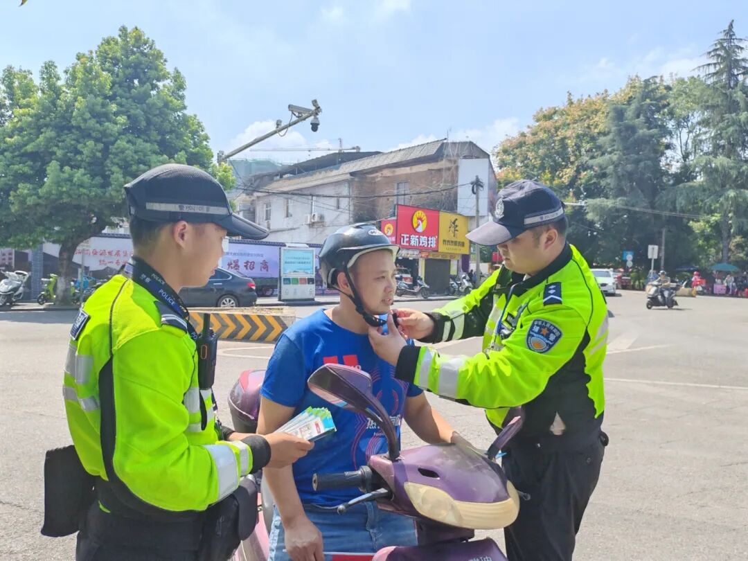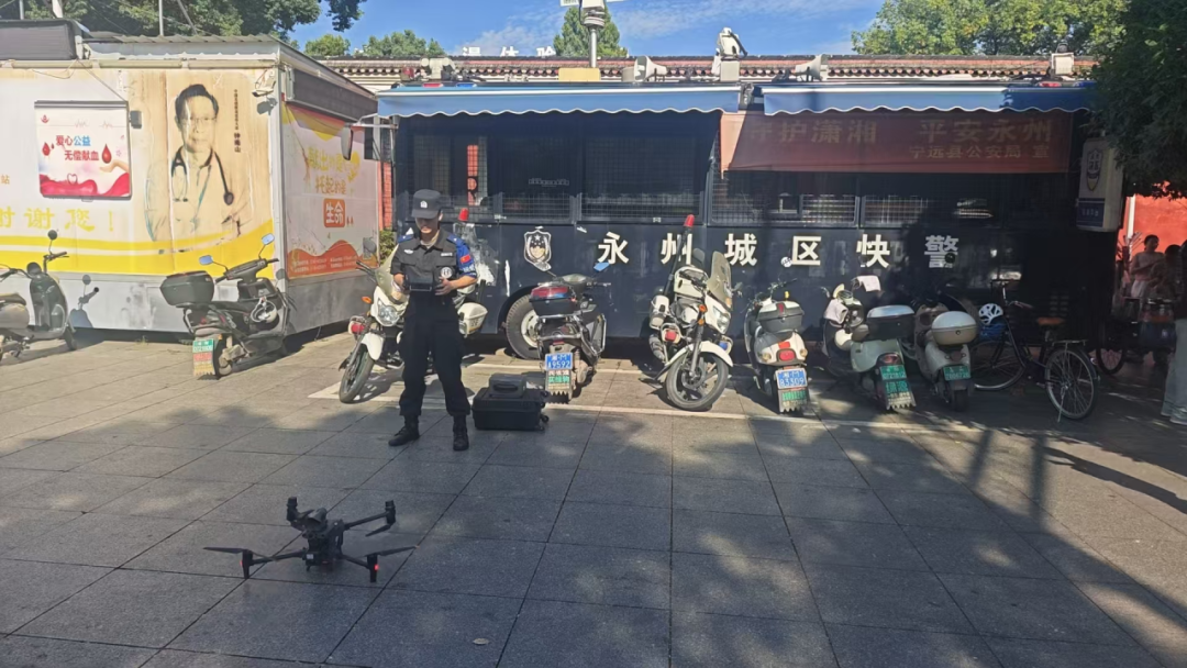 ▲永州公安交警通过无人机实时监测车流动态,劝阻交通违法行为,并提醒摩电车辆驾乘人员佩戴好安全头盔。