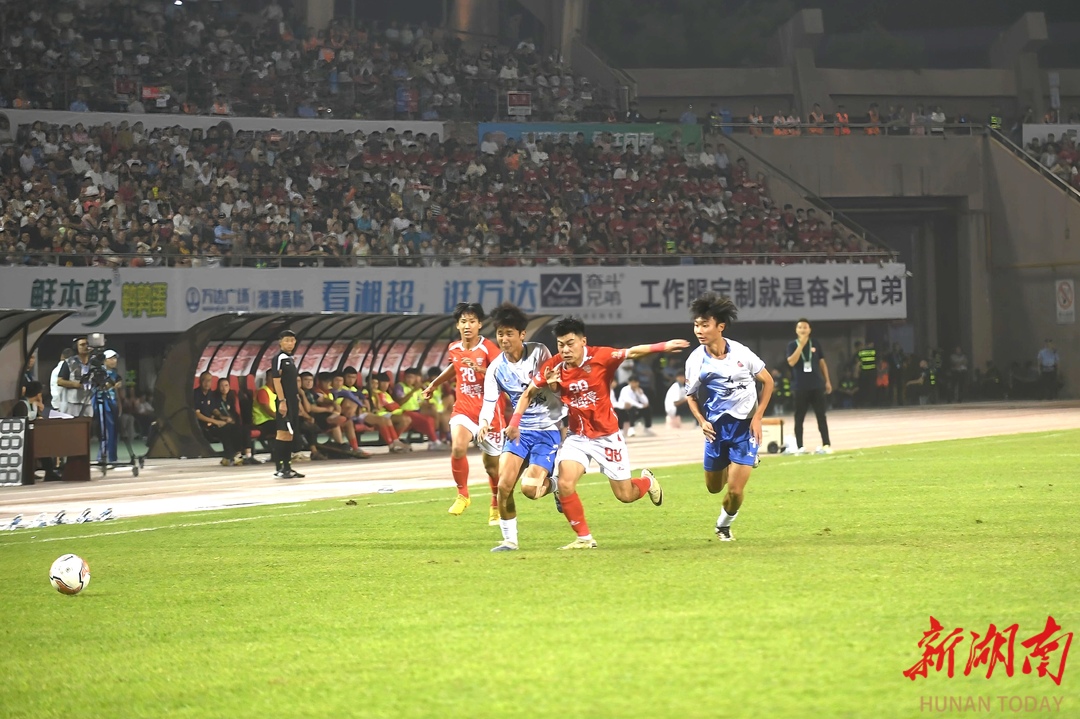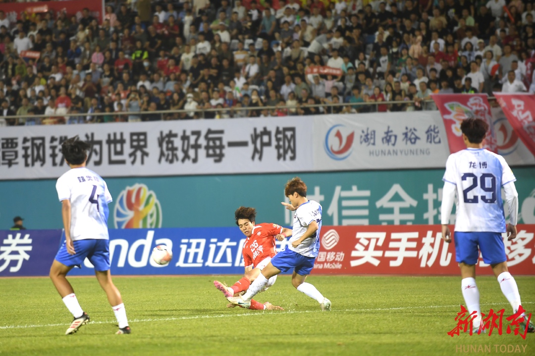 主场作战的湘潭队一改以往偏保守的风格,从开场就展现出进攻锐气。第18分钟,湘潭队前场右路送出直塞,23号球员成宇栋快速前插杀入禁区,被对方背后放铲犯规,主裁判罚点球。湘潭球员杨磊主罚一蹴而就,骗过门将将球稳稳送入网窝,湘潭队1:0领先。