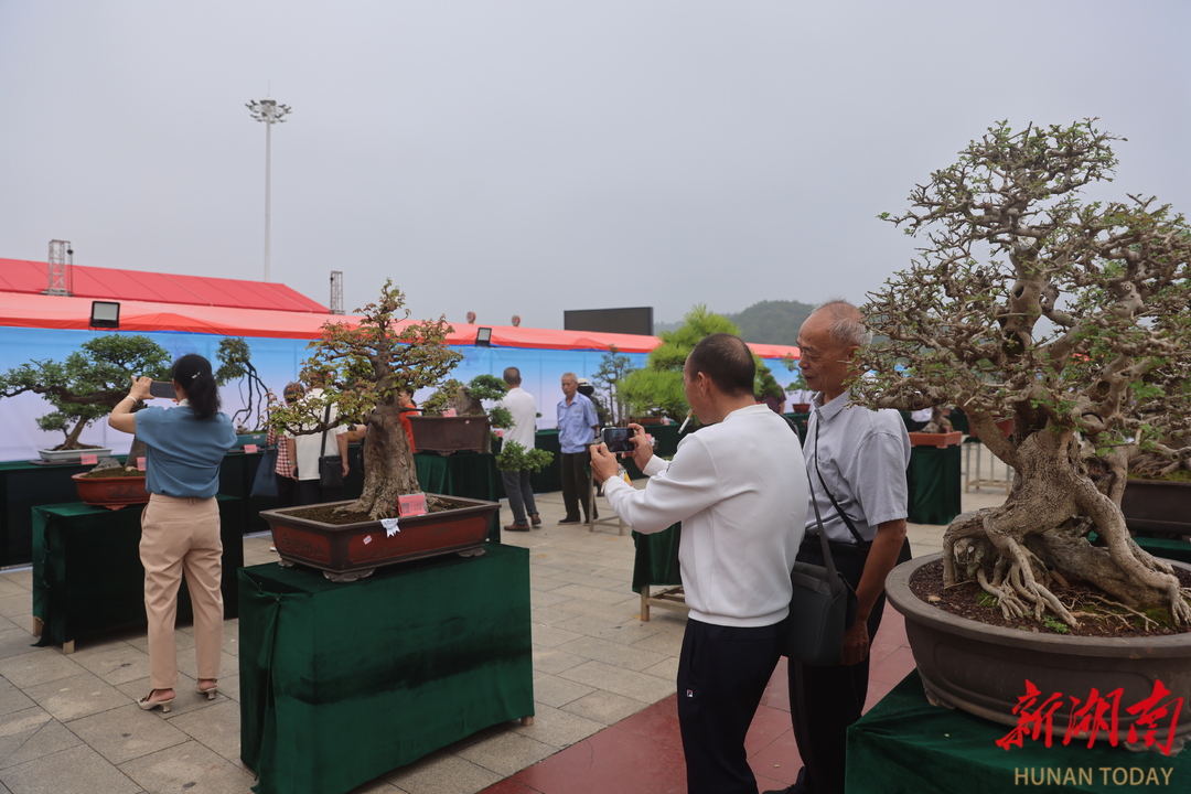 “一景一世界”。 10月1日,在“美丽衡东、‘盆’然心动” 精品盆景文化艺术展现场,松柏、杂木、花果、山水、树石盆景前,挤满驻足观赏的游客,不少人俯身细品盆景造型,交流观赏心得。游客或单独与盆景合影,或全家围绕展品拍摄全家福,其乐融融。