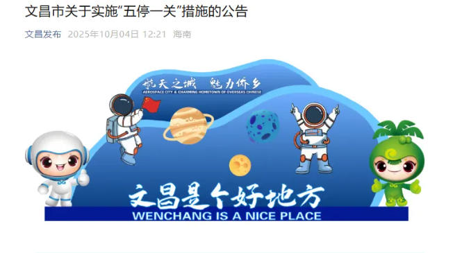 文昌4日发布了《关于实施“五停一关”措施的公告》,宣布停课、停工、停业、停运、停航,关闭所有景区。