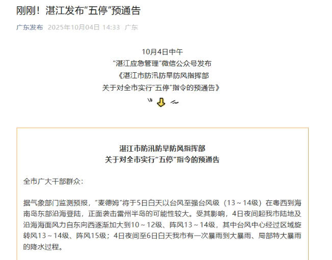10月4日中午,广东湛江也发布了《湛江市防汛防旱防风指挥部关于对全市实行“五停”指令的预通告》