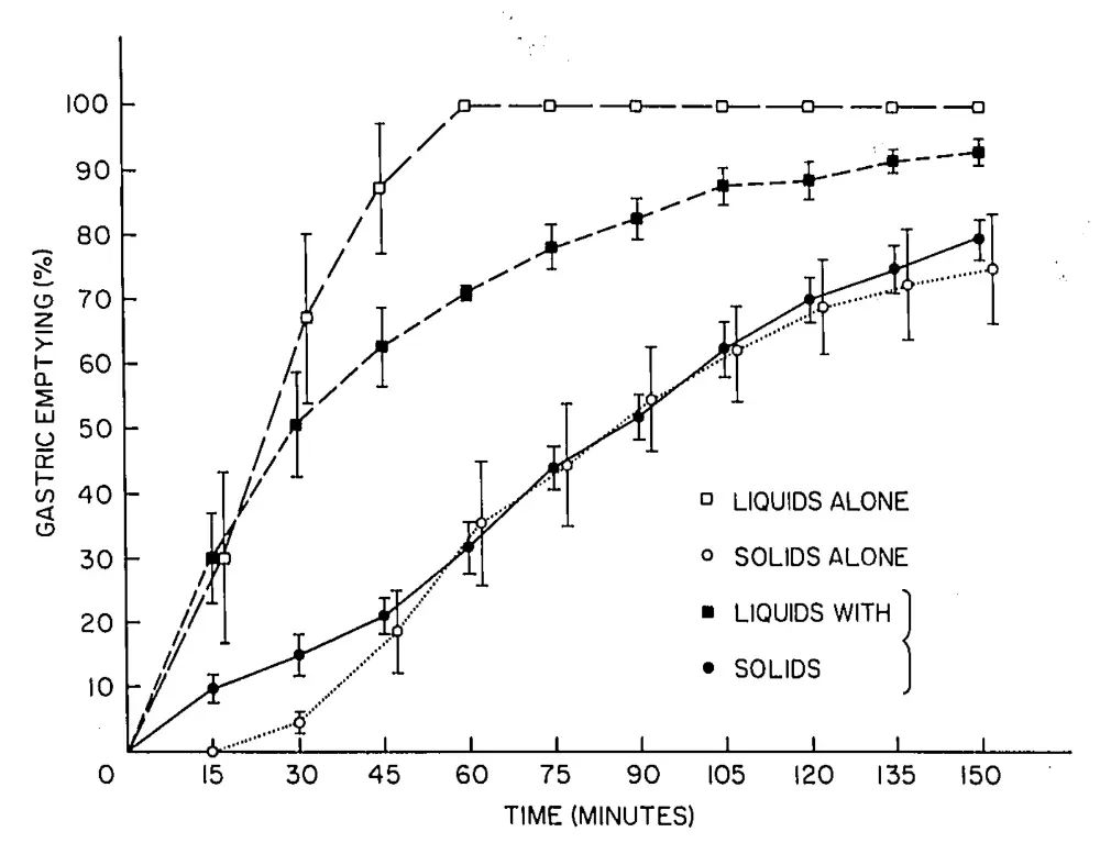影像学研究发现,液体和固体在胃里的排空速度本就不同。液体通常以指数曲线方式迅速离开胃部,而固体则需要先被研磨到直径小于1毫米,才能一点点通过幽门进入小肠,因此排空速度更慢。当两者混合进餐时,液体的排空会受到固体的轻微延迟影响,但固体的排空几乎不受液体影响。[1]换句话说,一口饭配一口水,并不会让食物泡在胃里动弹不得。