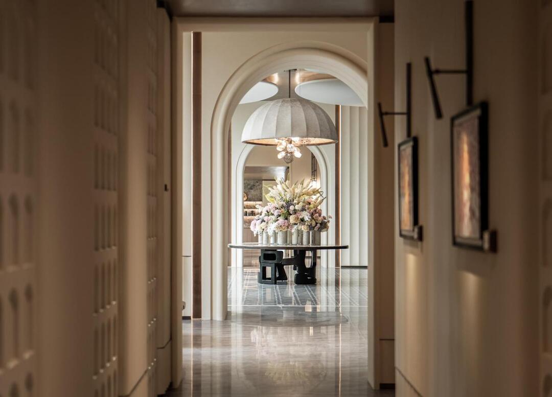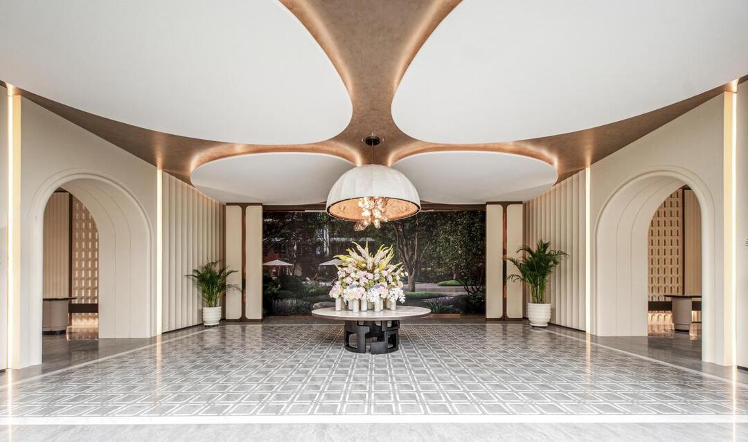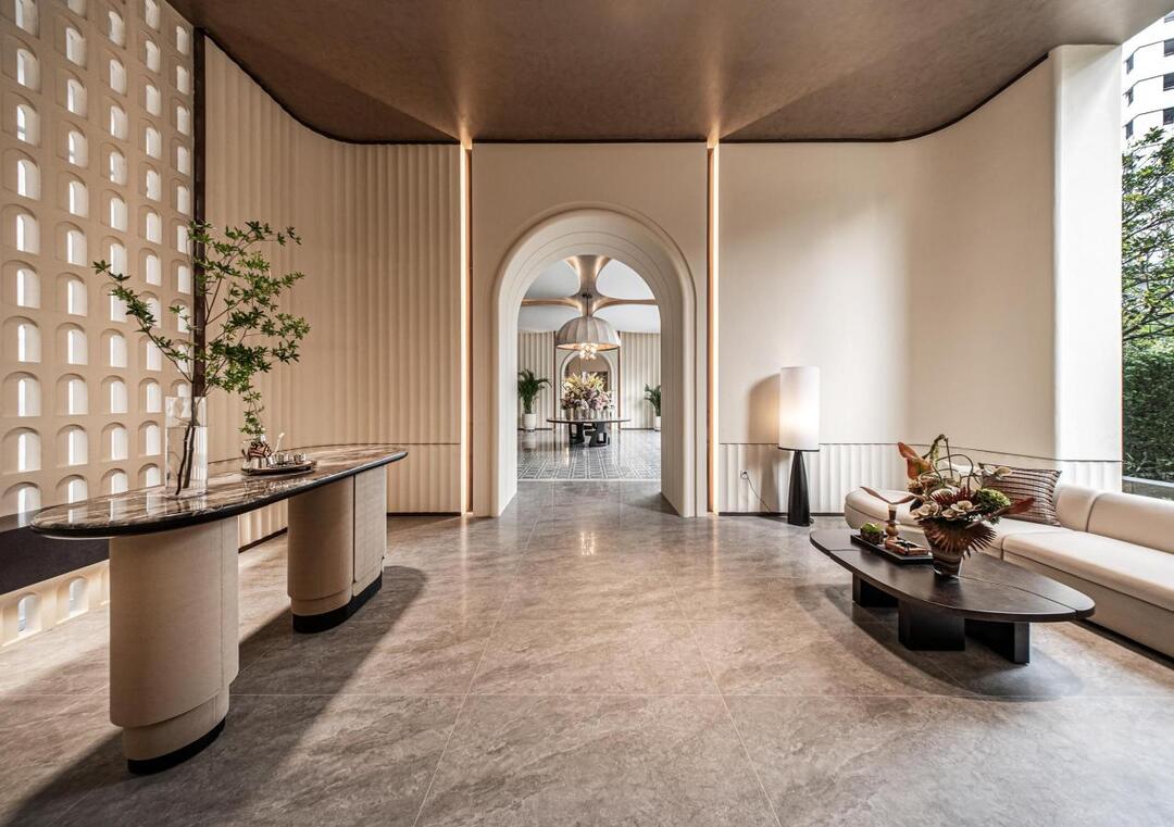 同源奢华酒店「见光不见灯」的无痕光影美学,采用二次反射照明技术将光源藏于建筑肌理,通过半隐藏式造型规避直射光的刺眼感,使光线如晨雾般自然,以沉浸式情绪舒缓,让心情随光线一同舒展。顶部线性灯带与侧面格栅交织,光线沿归家动线逐步流转,从公共区域的明亮,到步入居所的柔和,每一步都伴随着情绪的舒缓。