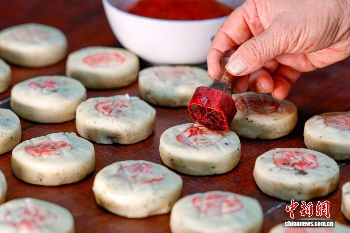 资料图:图为制饼手艺人将“徽式麻仁月饼”盖印。
