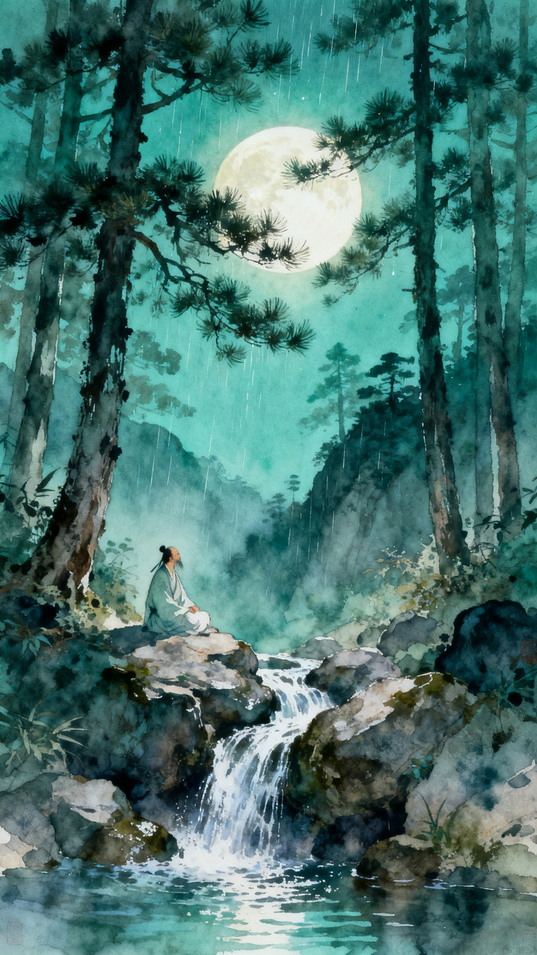 王维《山居秋暝》“明月松间照,清泉石上流”。雨后的秋月,穿过松林的间隙,洒下清辉。这里的月是澄澈、空灵的,它与清泉、松石共同构成一个一尘不染的禅意世界,象征着诗人所追求的高洁品格与归隐理想。