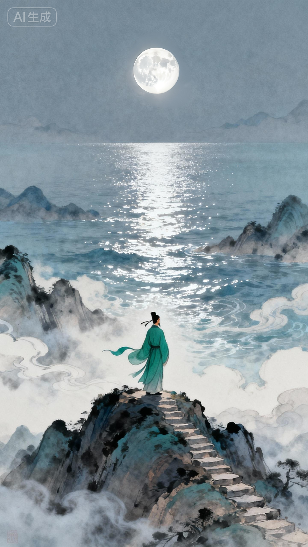 如张若虚《春江花月夜》“人生代代无穷已,江月年年望相似”。诗人面对江月,展开了一场关于宇宙与生命的宏大对话。个体的生命是短暂的,但人类的传承如流动的江水般永续;明月亘古不变,映照着一代又一代人。此境将月亮从情感载体提升到了哲学高度,哀而不伤。