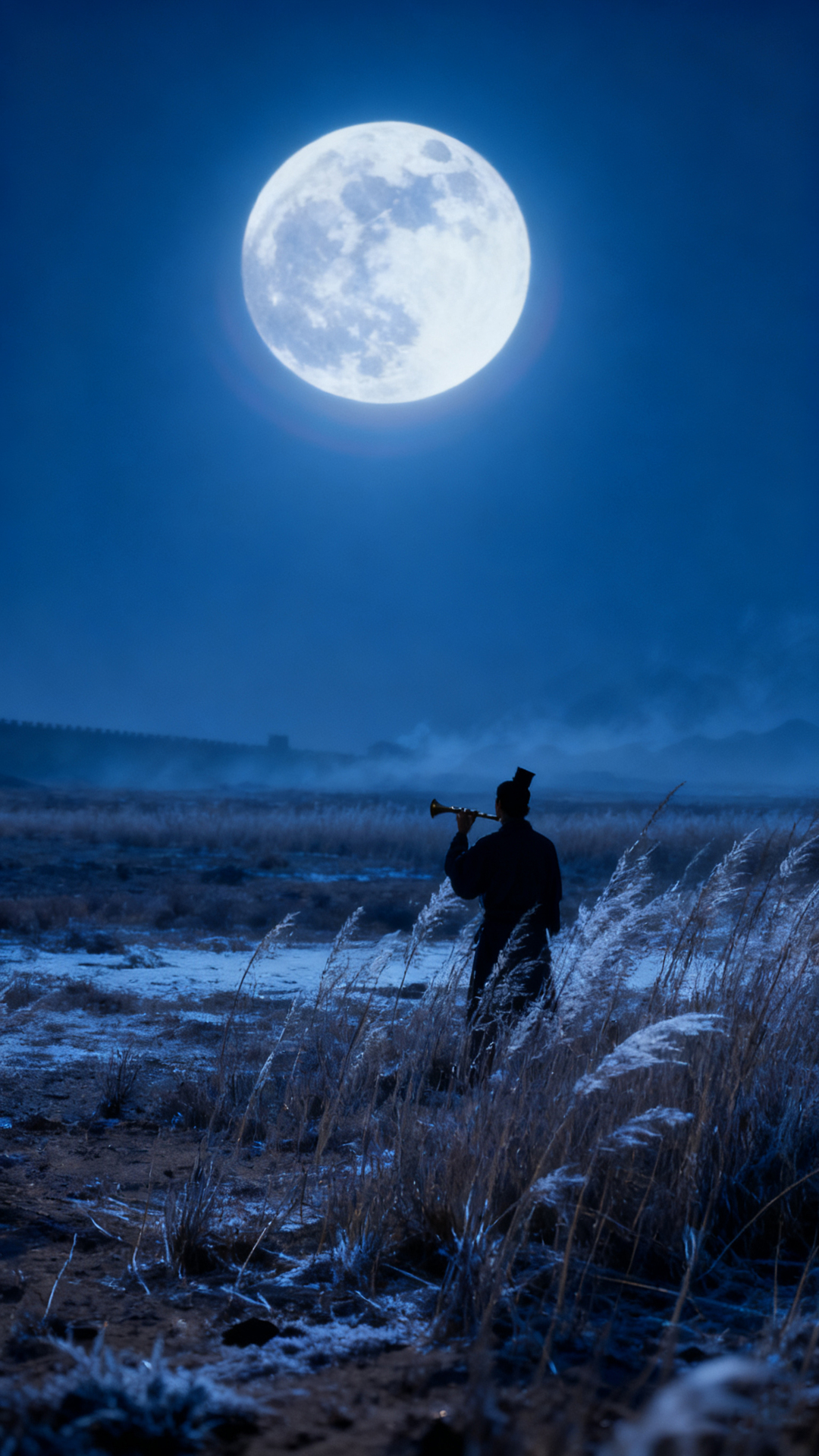 如戴叔伦《调笑令·边草》中“明月,明月,胡笳一声愁绝”的悲怆与空茫,词人于陇上边塞中,将心神浸入这片孤光寒色,以反复呼告的“明月”凸显其如影随形。其凄清的月轮、哀鸣的胡笳与枯寂的边草共同凝固成一曲羌笛,吹尽了征人无边的乡关与共望的秋霜。