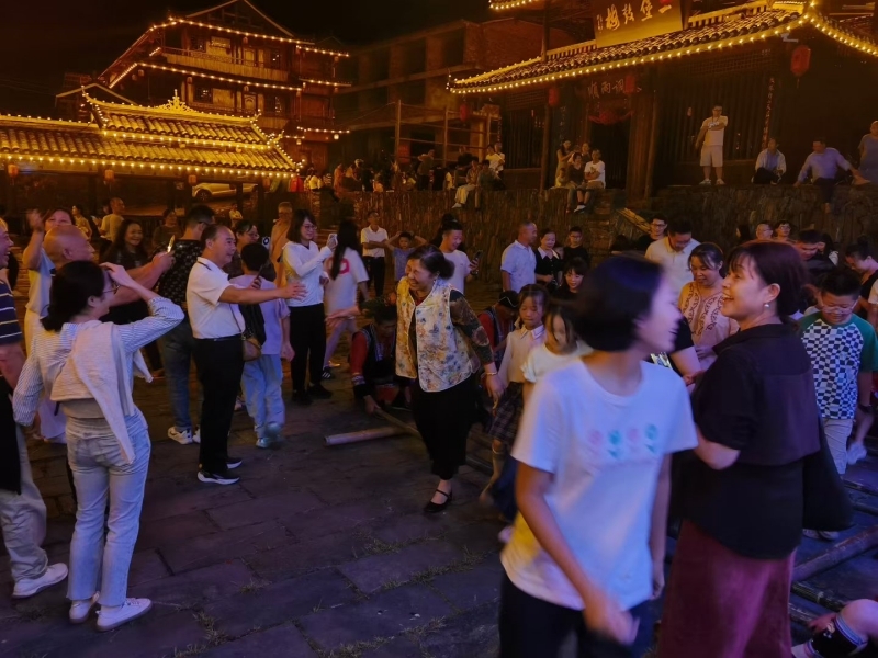 唱罢赞歌,民俗盛宴接踵而至。身着华丽民族服饰的侗族姑娘翩翩起舞,裙摆飞扬间尽显灵动;小伙子们以雄浑歌声与刚劲舞姿,展现着苗侗儿女的豪迈本色。《侗族大歌》的悠扬、《芦笙踩堂》的欢快、《敬酒》舞的热情接连上演,精彩表演让游客沉醉其中,阵阵掌声此起彼伏。随着篝火越烧越旺,晚会氛围推向高潮。游客与村民手牵手围成圆圈,跟随着动感鼓点尽情起舞。温暖的火光映照在每个人的笑脸上,陌生的距离被瞬间拉近,狂欢的身影与夜空的星光相映成趣,构成一幅民族团结的生动图景。