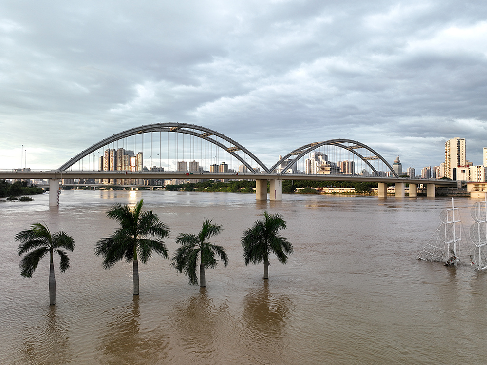 2025年10月5日23时,广西南宁市邕江城区河段水位74.04米(警戒水位73米),目前呈现下降走势。紧接20号台风“博罗依”之后,21号台风 “麦德姆”6日起将继续带给广西强降雨。图为邕江沿岸的树木仅剩树冠露出在水面上。(无人机照片) 中新社记者 王以照 摄