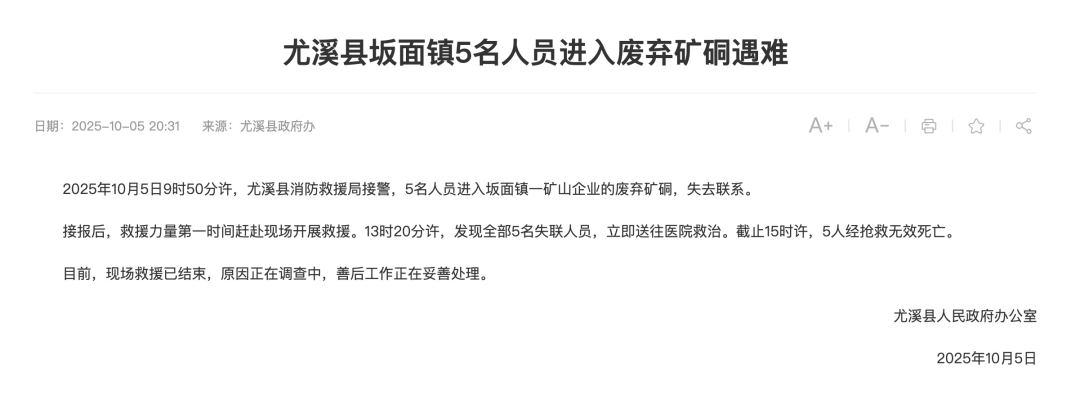 2025年10月5日9时50分许,尤溪县消防救援局接警,5名人员进入坂面镇一矿山企业的废弃矿硐,失去联系。