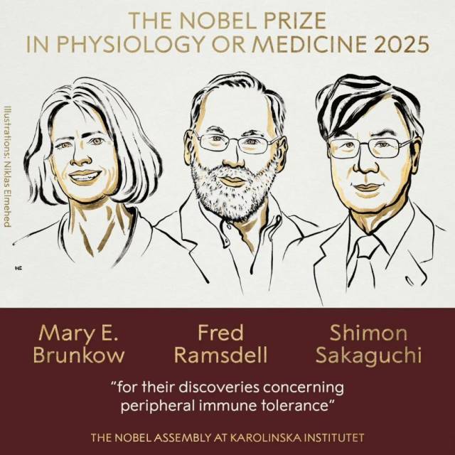当地时间10月6日,瑞典卡罗琳医学院宣布,将2025年诺贝尔生理学或医学奖授予科学家玛丽·E·布伦科(Mary E. Brunkow)、弗雷德·拉姆斯德尔(Fred Ramsdell)和坂口志文(Shimon Sakaguchi),表彰他们在外周免疫耐受方面的研究贡献。