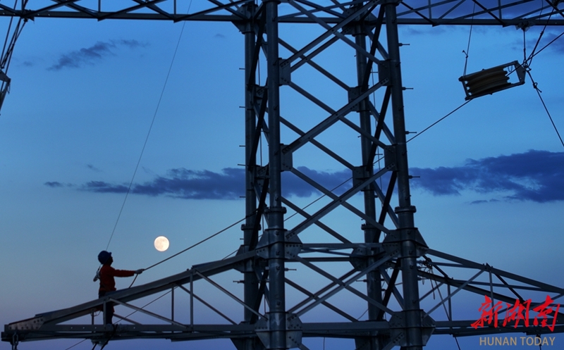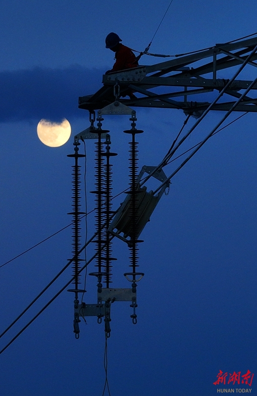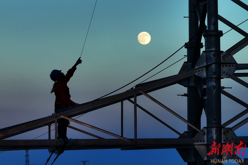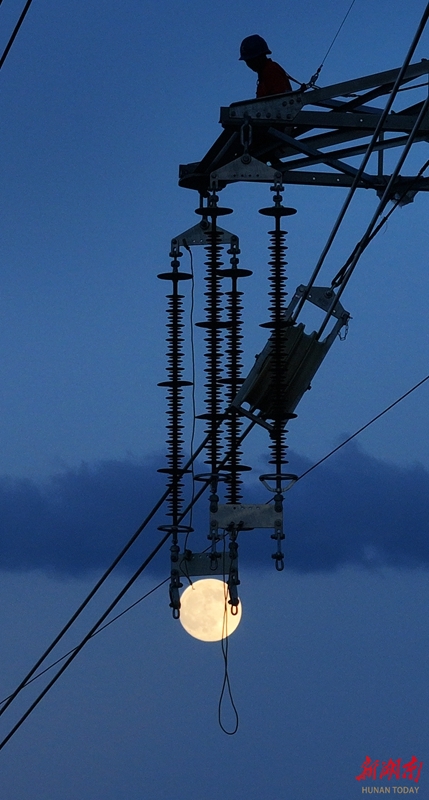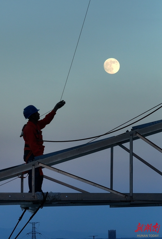 10月6日,衡阳市雁峰区南三环路上,正在高塔上进行架线施工的湖南雁能建设集团有限公司工程人员与初升的中秋圆月不期而遇。当天是中秋节,不少劳动者坚守岗位,保安全促生产,守护万家团圆。曹正平 摄(湖南图片库)