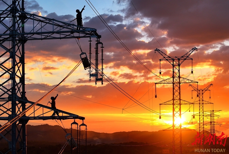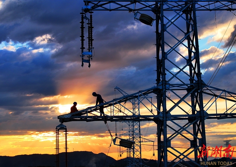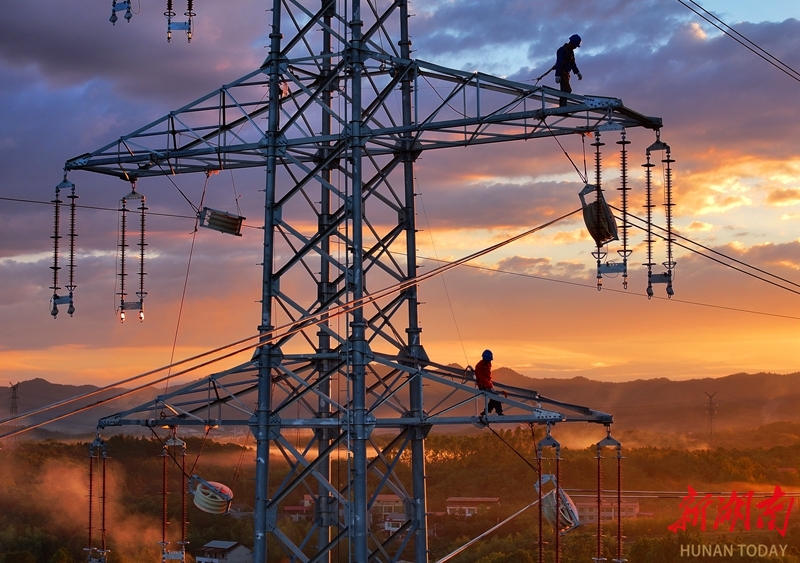 10月6日,衡阳市雁峰区南三环路上,湖南雁能建设集团有限公司的施工人员在高塔进行架线施工作业。当天是中秋节,不少劳动者坚守岗位,保安全促生产,守护万家团圆。曹正平 摄(湖南图片库)