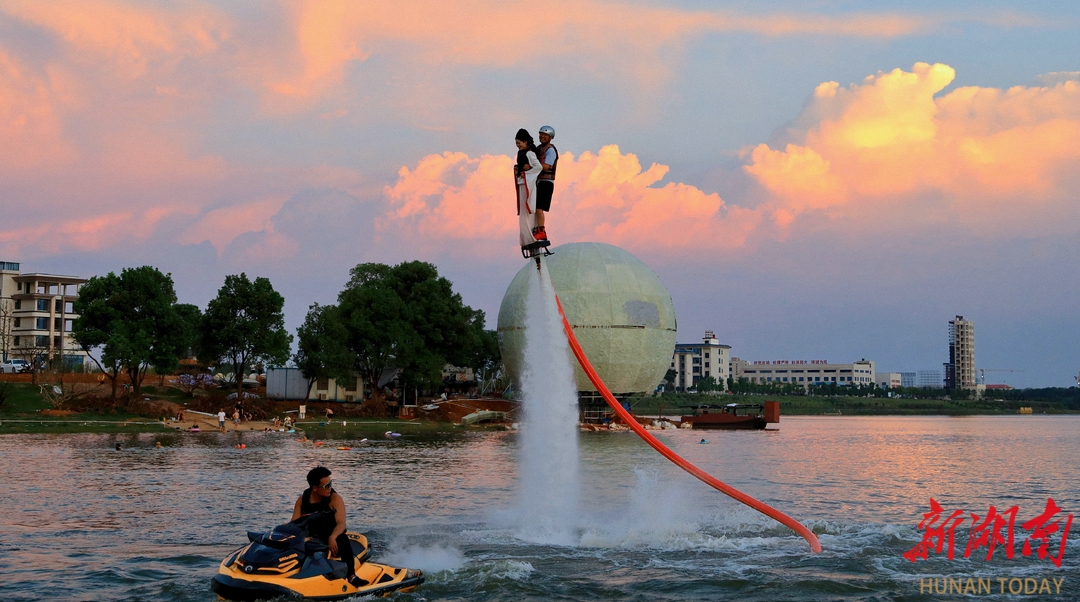 彩虹岛景区,游客在体验“水上飞人”项目。李跃红 摄