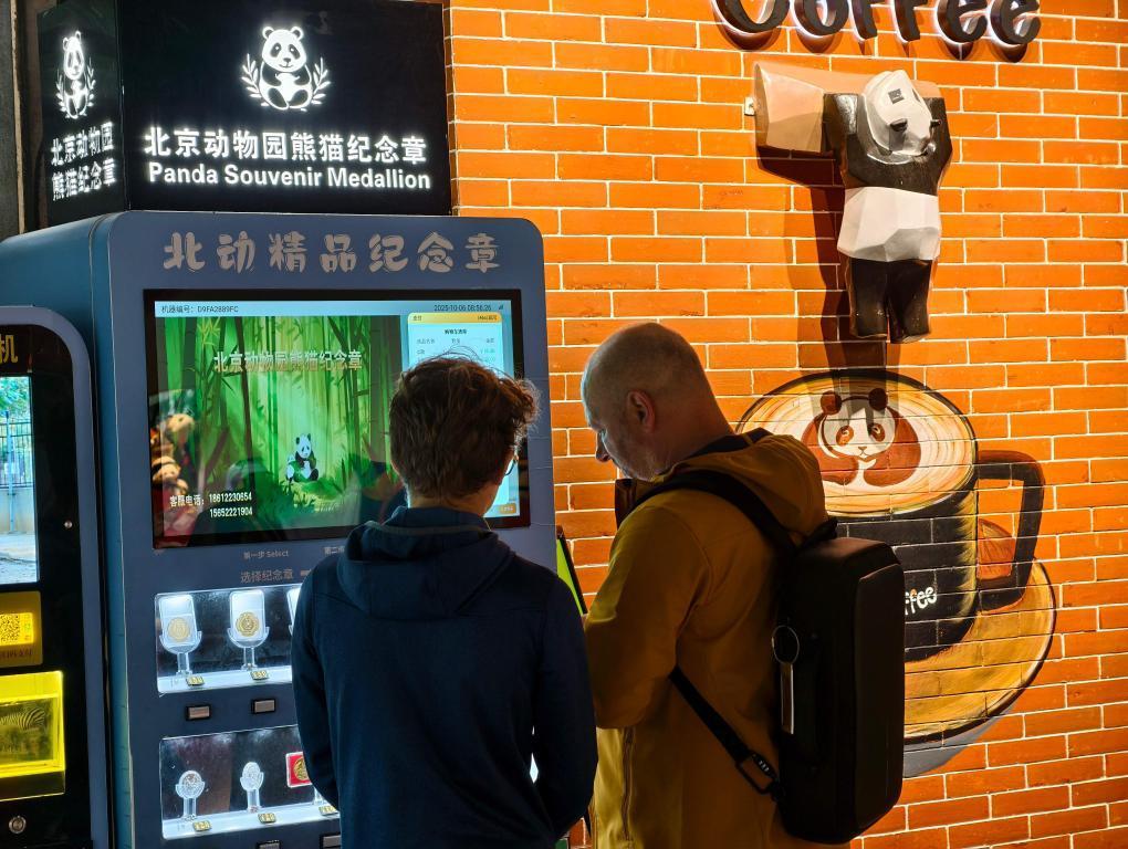 △10月6日,外国游客购买北京动物园熊猫纪念章。