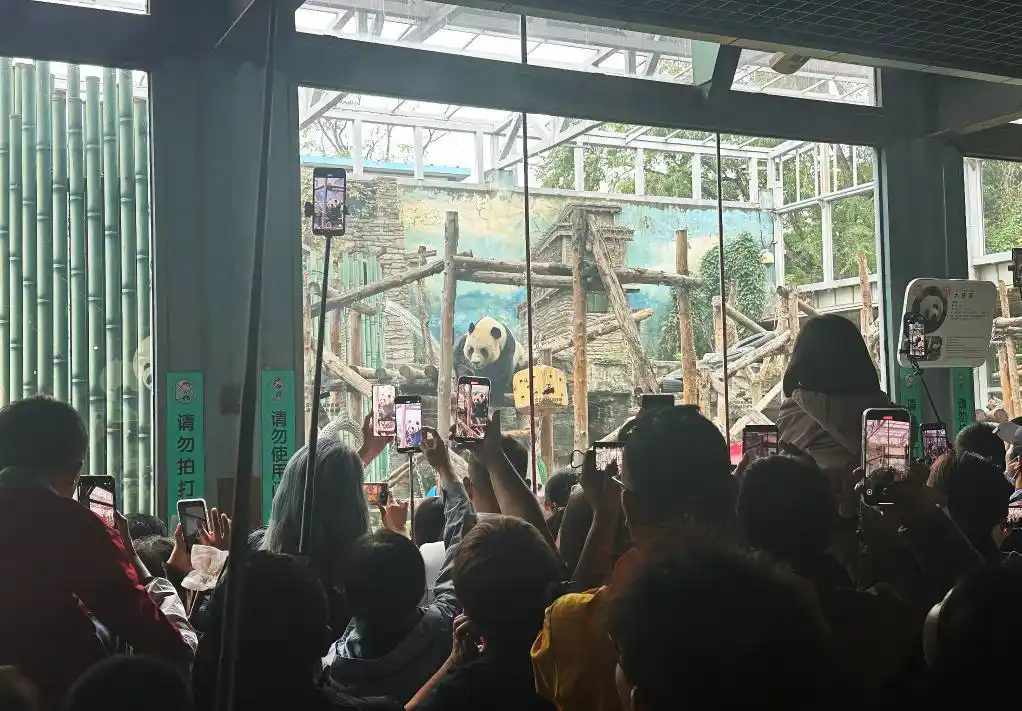展厅玻璃前,里三层外三层围满了游客,大家高举手机、相机,不想错过大熊猫的每个精彩动作。只见活泼的“吉年”一会儿爬上木架,一会儿去玩水,一会儿又坐下来尽情啃着竹笋。“福将”则与写着“花好月圆”的丰容玩具打得火热,憨态可掬的模样惹人怜爱。
