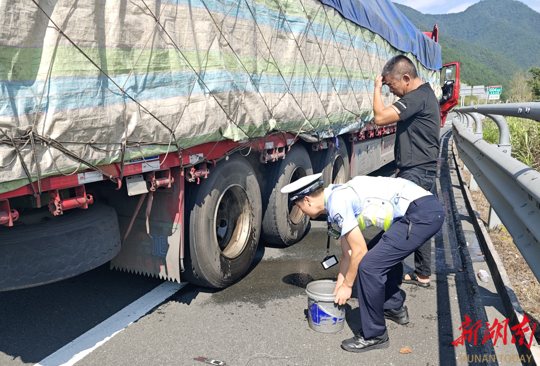 10月1日9时许,炎陵大队民警巡逻至武深高速往北537公里处,发现一台大货车轮胎因温度过高冒烟,民警随即通过喊话引导其停靠在应急车道进行降温处理,及时消除安全隐患。