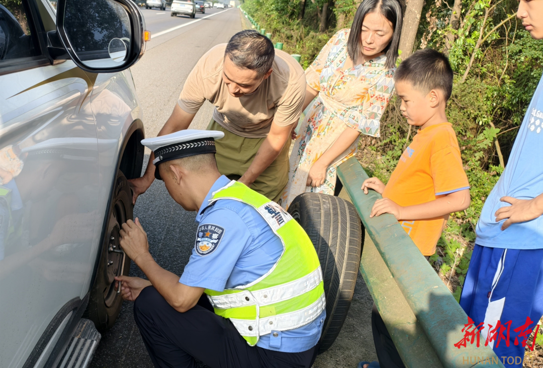 高速上小车突发爆胎 民警帮助换胎护送离开