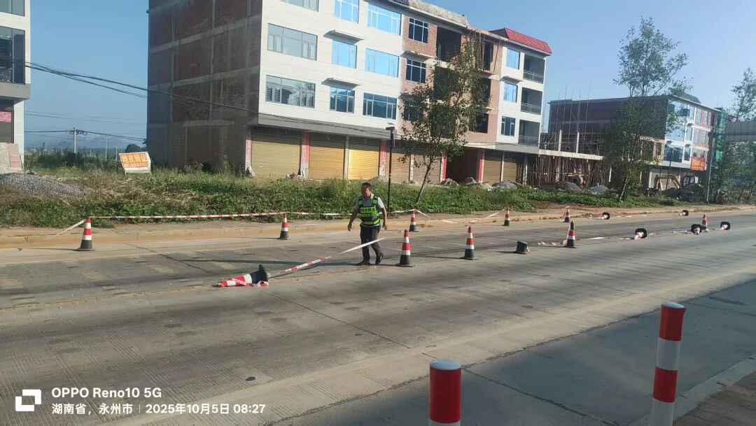 10月5日,宁远县禾亭镇工作人员在宁新公路禾亭镇段及时放置警示锥桶,守护群众出行平安。