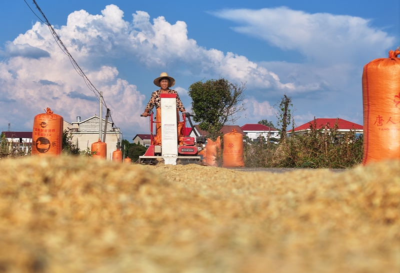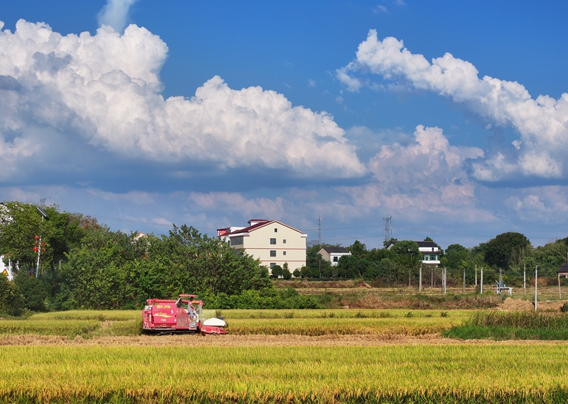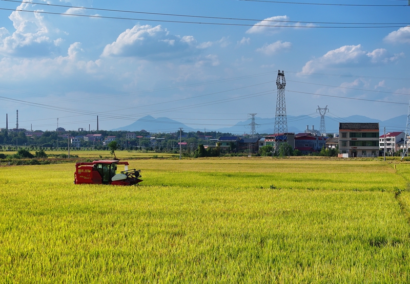 10月7日,衡东县大浦镇,村民驾驶农机收割稻谷。寒露将至,各地农民抢抓农时开展农事活动。曹正平 王峥 摄影报道(湖南图片库)