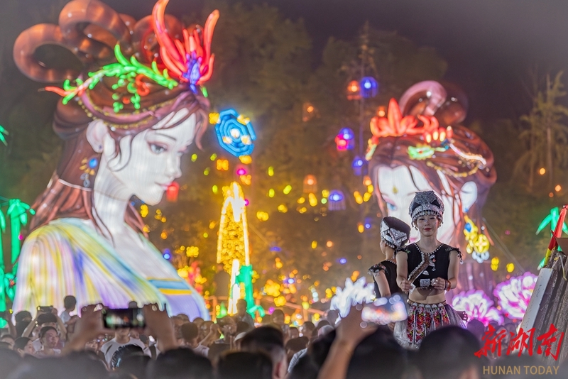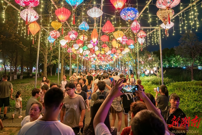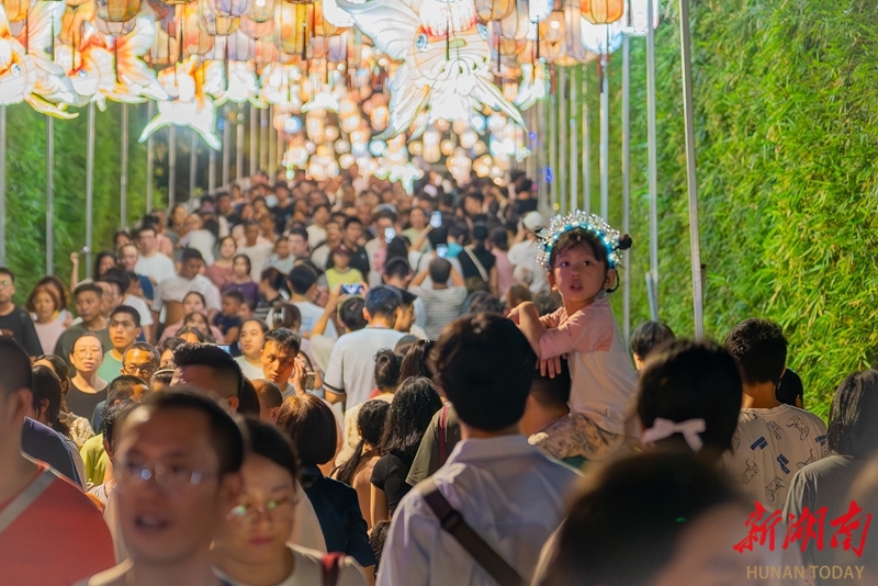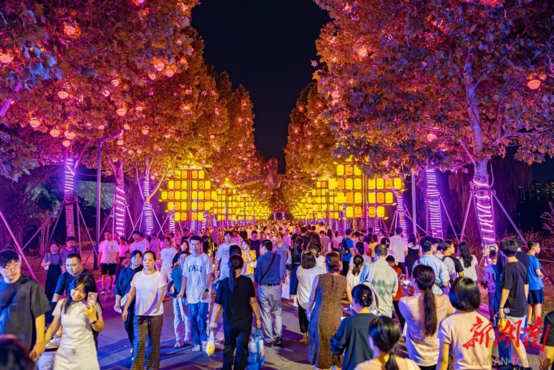 10月7日晚,游客在长沙洋湖国家湿地公园观赏花灯、观看演出。国庆中秋双节期间,游客走进“光影世界”沉浸式感受双节假期的热闹氛围。 湖南日报全媒体记者 童臻熙 摄