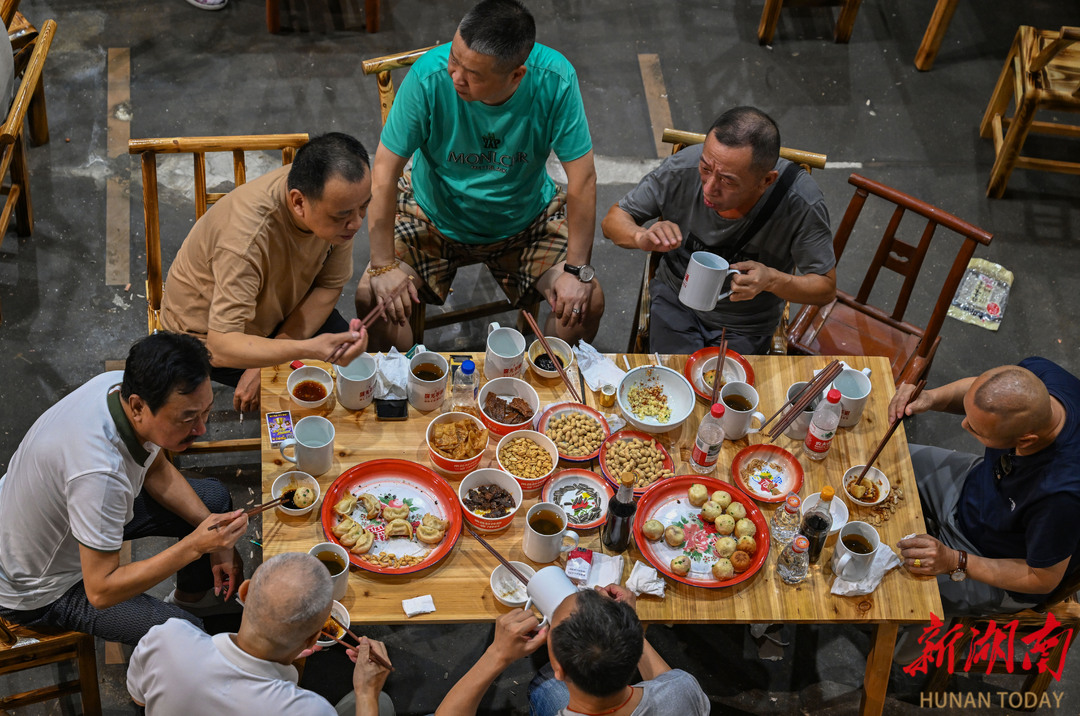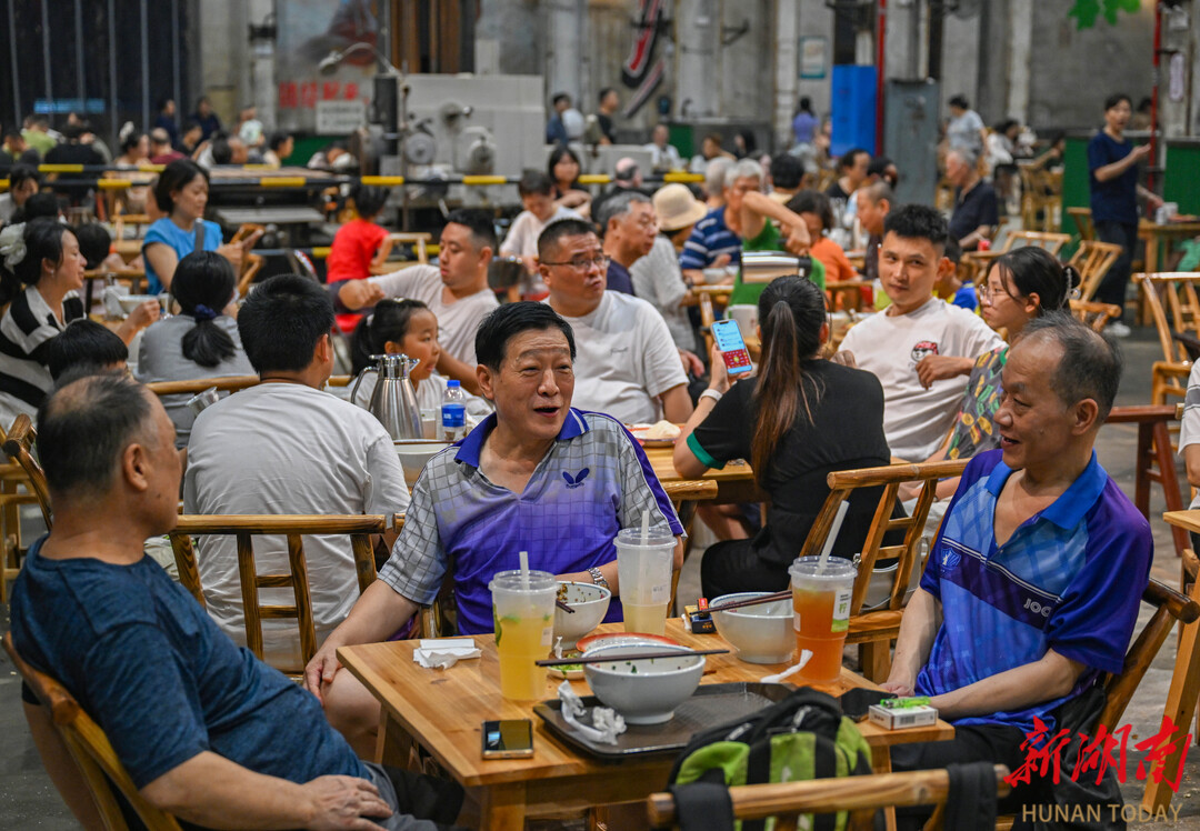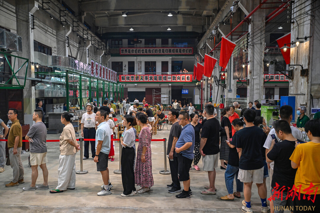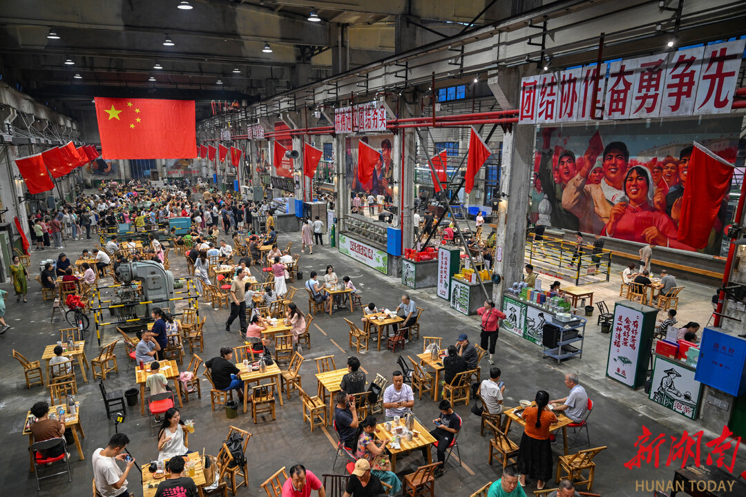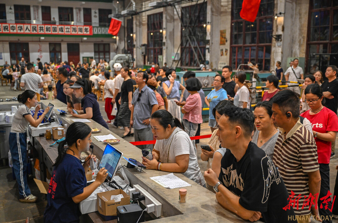 10月7日,游客和市民在曙光茶厂品尝长沙特色小吃。国庆中秋假期,长沙市雨花区“飞碟营地”人气爆棚,新改造的曙光茶厂试营业,吸引众多游客前来打卡。湖南日报全媒体记者 郭立亮 摄
