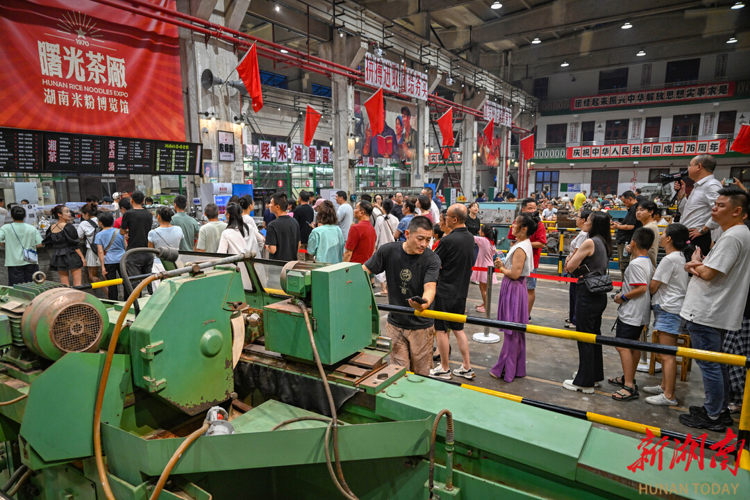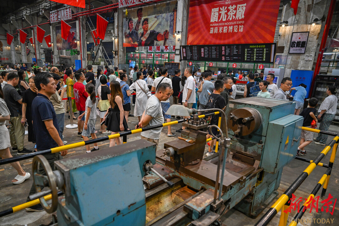 该厂前身为核工业中南地质局下属的233厂,以生产铀矿地质钻探设备为主,历经改制与产业更迭,后更名为湖南飞碟新材料有限公司,老厂区最终留下12栋旧厂房。如今,老旧厂房的红砖墙、老机器与时代标语依旧,保留着老工厂的时代记忆,内部却焕新为湖南米粉博览馆、茶叶陈列馆、咖啡馆、绿植店与艺术馆。工业遗存与现代生活交融,正成为连接历史与潮流的网红打卡地。湖南日报全媒体记者 郭立亮 摄