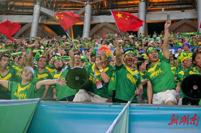 10月5日晚,郴州市体育中心,2025湘超联赛第四轮,郴州队主场对阵株洲队,球迷在呐喊助威。陈哲君 摄(湖南图片库)