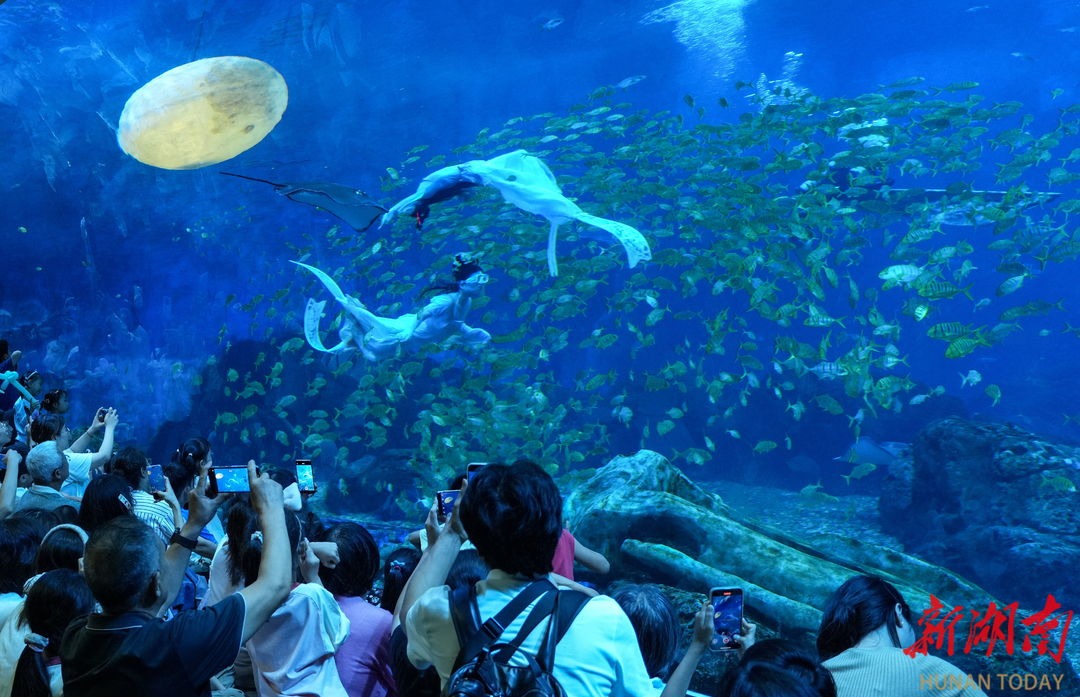 10月6日,长沙大王山旅游度假区湘江欢乐海洋公园,游客在观赏水下嫦娥奔月表演。罗斌 摄(湖南图片库)