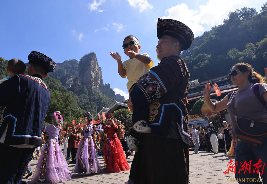 10月6日,张家界国家森林公园杨家界景区,当地文艺团队和游客齐跳摆手舞。吴勇兵 摄(湖南图片库)