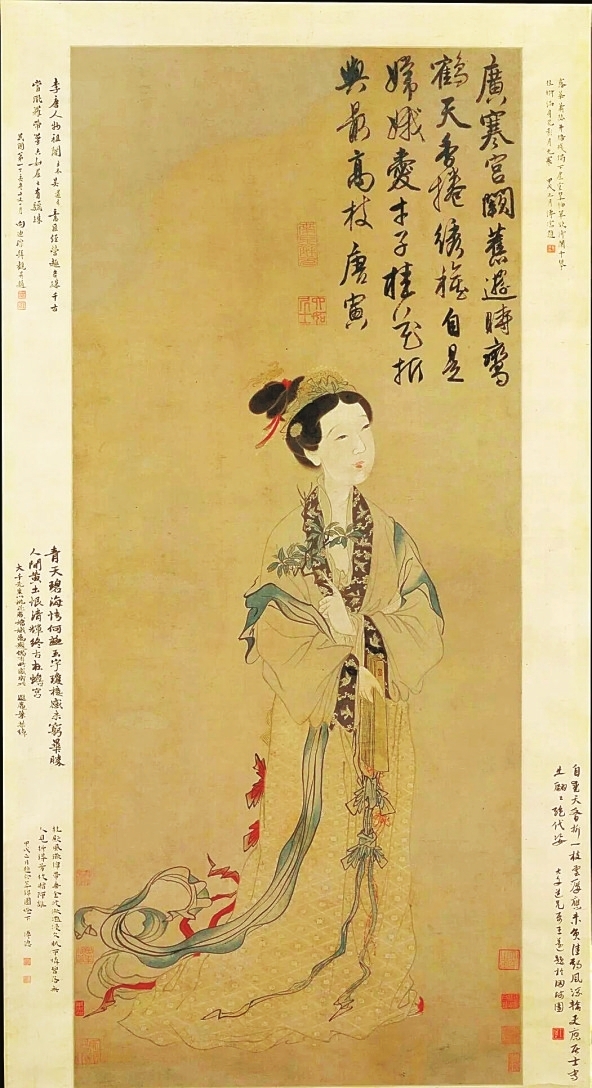 相较于《奔月图》的苍凉,《嫦娥执桂图》这幅画,是静的。嫦娥已不在空中,她站在庭院里。金钗玉带华贵而不失清雅,眉宇间虽带落寞,却因桂枝的点缀而透出生机。手执一枝桂花,神态娴静。她不再是奔月的神女,而成了一位文人化的仕女。