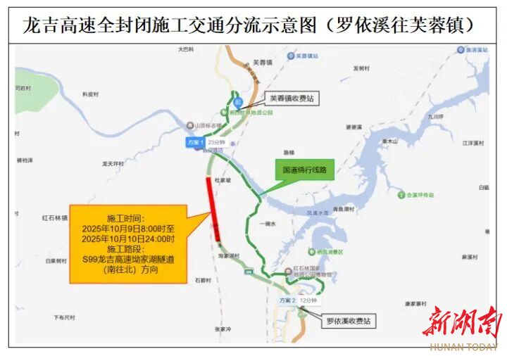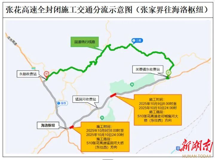 新湖南客户端10月8日讯(湘高)湖南省公安厅交通管理总队高速公路七支队、湖南省高速公路集团有限公司湘西分公司发布信息,为整治S99龙吉高速、S10张花高速部分桥梁、隧道情况,提升司乘人员的出行体验,将于10月9日至10日对S99龙吉高速茅坪隧道(南往北)、坳家湖隧道(南往北),S10张花高速老司城施河大桥(东往西)、猛洞河大桥(东往西)进行交通管制施工。