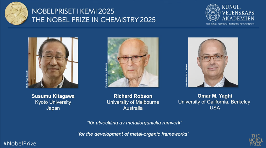 北京时间10月8日17时45分,瑞典皇家科学院宣布,将2025年诺贝尔化学奖授予日本京都大学北川进(Susumu Kitagawa)、澳大利亚墨尔本大学理查德·罗布森(Richard Robson)和美国加州大学伯克利分校奥马尔·亚吉(Omar M. Yaghi),以表彰他们“开发金属有机框架”。