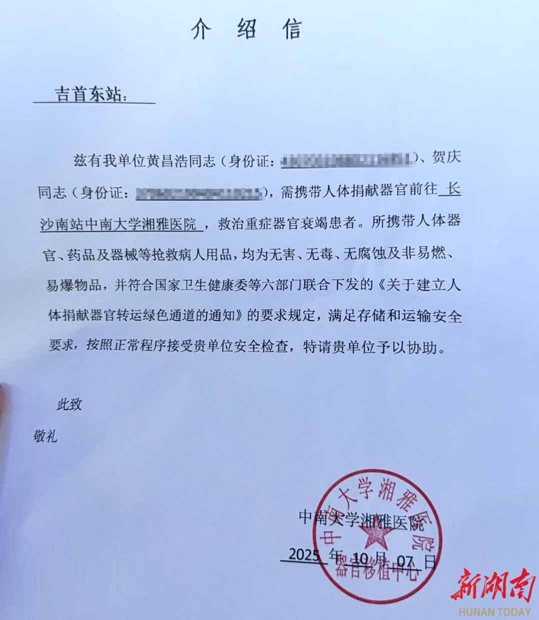 新湖南客户端10月9日讯(通讯员 姚博然)10月7日,吉首东站上演了一场惊心动魄的生命接力。当天17时50分,中南大学湘雅医院器官移植中心的2名医生,携带珍贵的“生命礼物”——两个肾脏和一个肝脏,紧急抵达吉首东站。这些器官,承载着长沙三位患者重生的希望,时间紧迫,每一秒都至关重要。