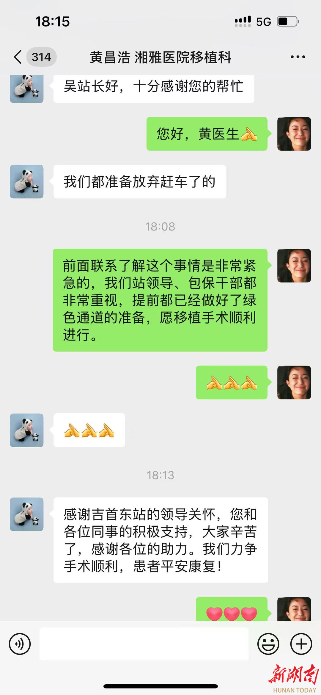 17时54分,G6473次列车满载着生命的希望,准时驶离吉首东站,向长沙疾驰而去。20时25分,列车准时抵达长沙南站,医生第一时间发来感谢信息,对吉首东站的高效协助表示由衷赞叹。