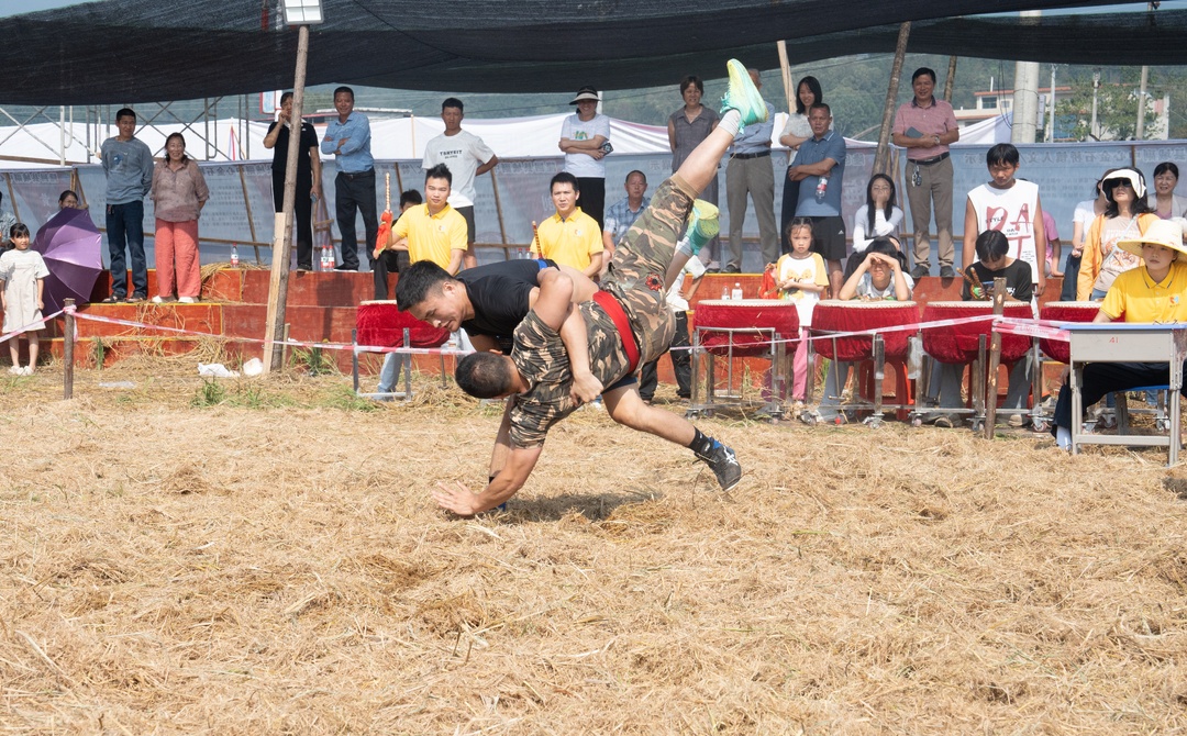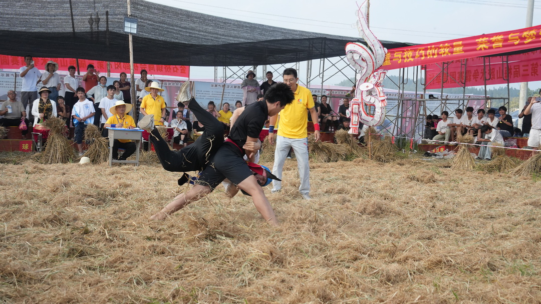 新湖南客户端10月9日讯(通讯员 罗朝 记者 胡旻)当千年农耕文明邂逅传统武术,会迸发出怎样的文化火花?10月4日至5日,传承千年的“梅山跤术”与丰收的稻田激情相拥,一场独一无二的体育文化盛宴——邵阳市第三届“梅山跤术争霸赛”在隆回县金石桥镇育英小学后一片金色的“稻田赛场”上激情上演,来自六省十三市的320余人在稻田“箍架”、土桥“跤”友,共展梅山跤术的独特魅力。
