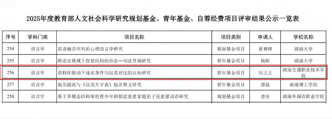 近日,教育部社会科学司发布《教育部社科司关于2025年度教育部人文社会科学研究一般项目评审结果的公示》,湖南交通职业技术学院公共教学部博士刘立立老师申报的“语料库驱动下违实条件句汉英对比的认知研究”课题获青年基金项目立项。