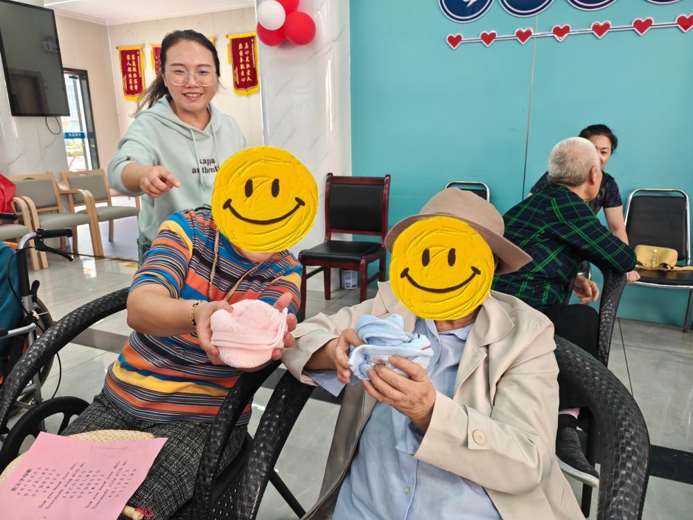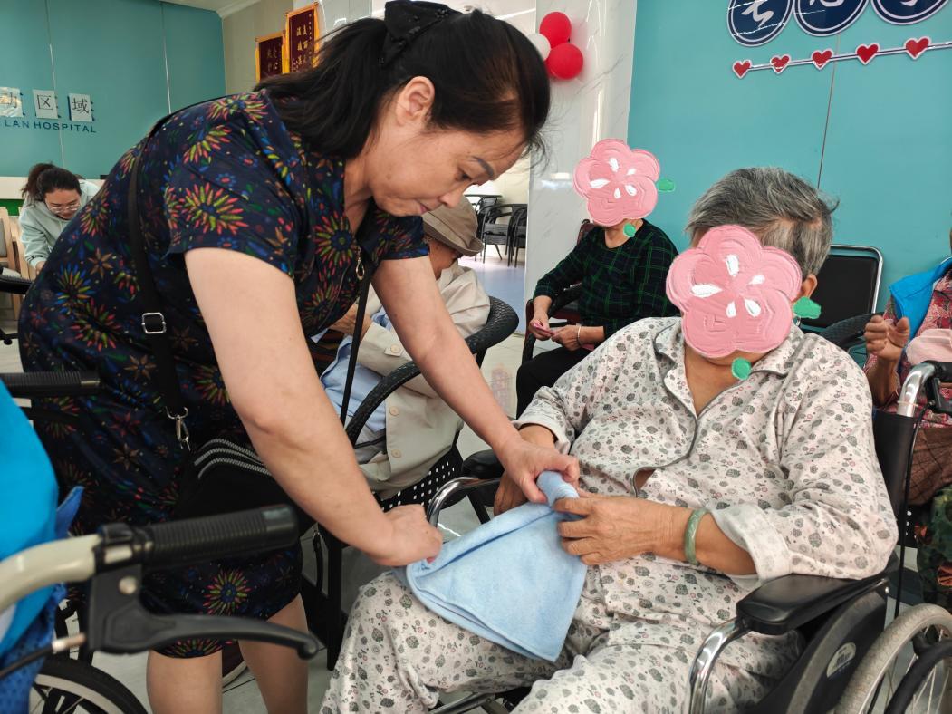 手工制作环节将活动推向又一个高潮。在教师唐路一的耐心示范下,老人们学习用普通毛巾折叠制作小动物与花朵。只见毛巾在她手中翻飞几下,便陆续“变”出憨态可掬的小兔子和造型别致的玫瑰花。老人们兴致盎然,在老师的协助下亲手尝试,尽管动作不甚熟练,但每个人都全心投入。随着一件件生动可爱的手工作品陆续完成,老人们脸上绽放出满足而自豪的笑容。
