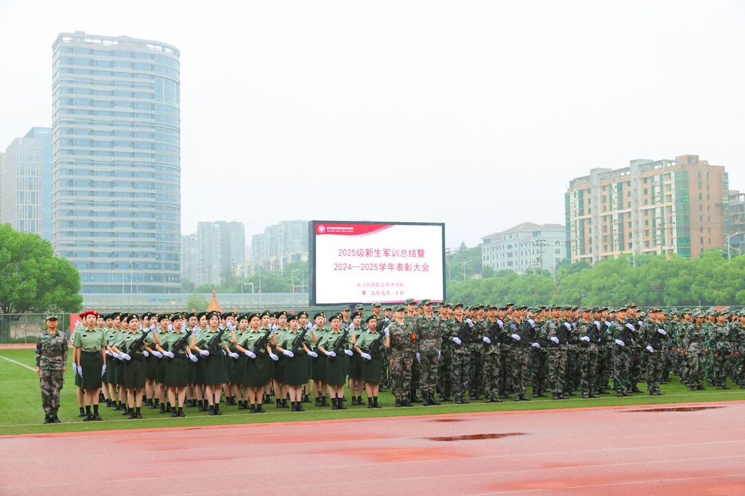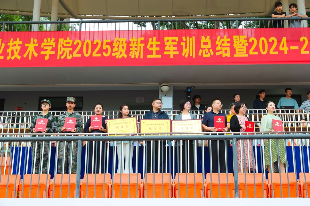 在宣读了《关于表彰2025级新生军训先进集体和优秀个人的决定》《关于表彰2024—2025学年校级先进集体和优秀个人的决定》后,主席台领导向获奖集体和个人颁发了牌匾和荣誉证书。长沙民政职院外语学院、艺术学院、殡仪学院凭借在军训期间出色的表现被评为“军训优胜营”。