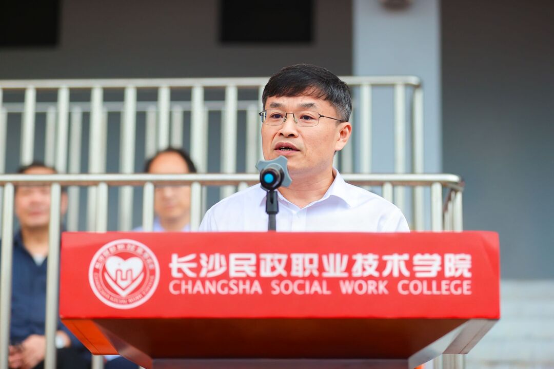 大会在雄壮的国歌声中拉开帷幕,五星红旗冉冉升起,全体师生肃立齐唱国歌,并向国旗行注目礼。大会伊始,长沙民政职院党委书记李斌为全体师生讲授“开学第一课”,以“情怀、格局和毅力”三个关键词,与新生们分享大学三年的成长方向。一是涵养家国情怀、筑牢立身之本。他希望同学们将个人理想追求主动融入国家发展大局与民族复兴伟业,以“小我”之力成就“大我”之境。二是拓展时代格局,明晰成才之路。他勉励同学们深刻认清时代使命,以“科研报国、实干兴邦”的志向扎根专业学习。三是锤炼坚韧毅力,铸就卓越。他叮嘱同学们摒弃焦虑心态与空想思维,克服“手机依赖”等不良习惯,以“学好每一门课程、做好每一件小事”的坚持,用持之以恒的毅力和脚踏实地的行动,成就自己的梦想。