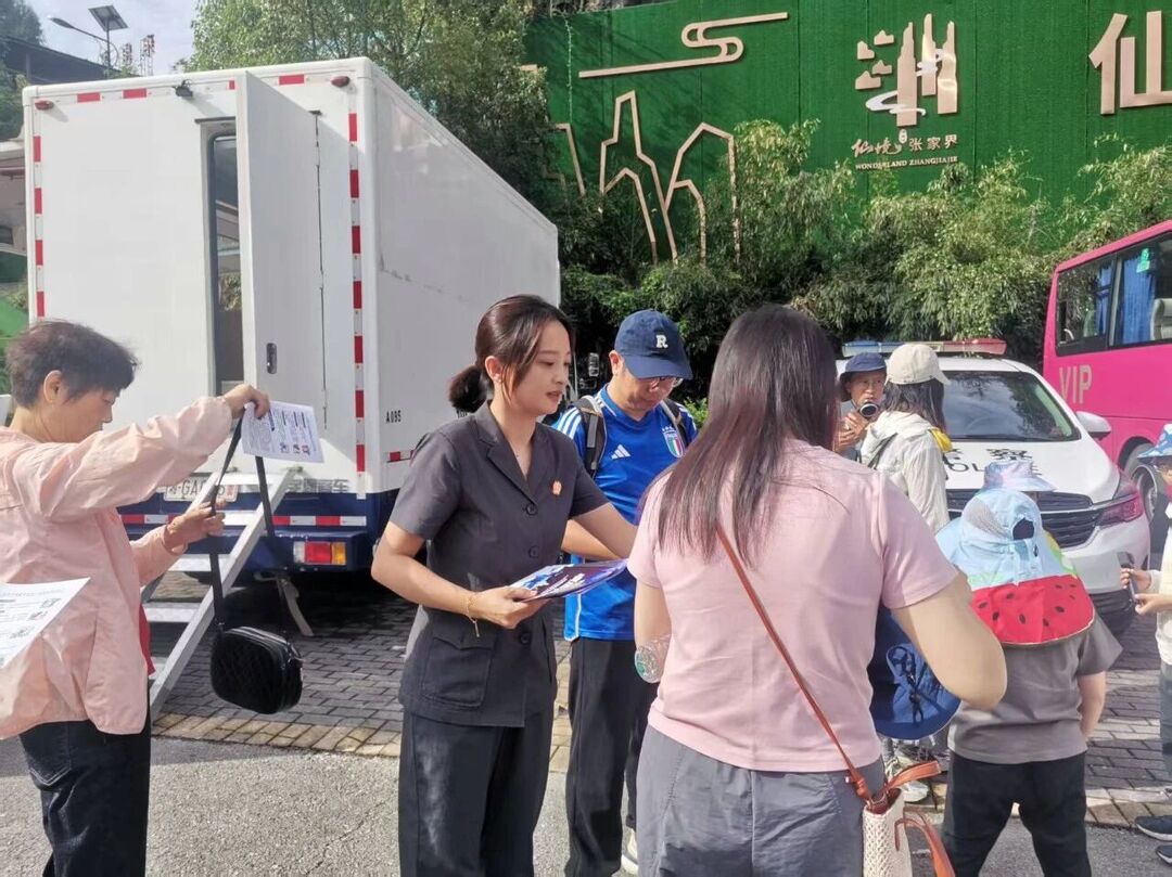干警结合《中华人民共和国旅游法》《中华人民共和国消费者权益保护法》,向游客普及“选择正规旅行社”“保留消费凭证”等维权要点,双节期间,累计发放宣传手册1500余份,接受法律咨询50余人次。针对老年游客群体,专项宣讲防范电信诈骗、非法集资知识,增强风险防范能力。