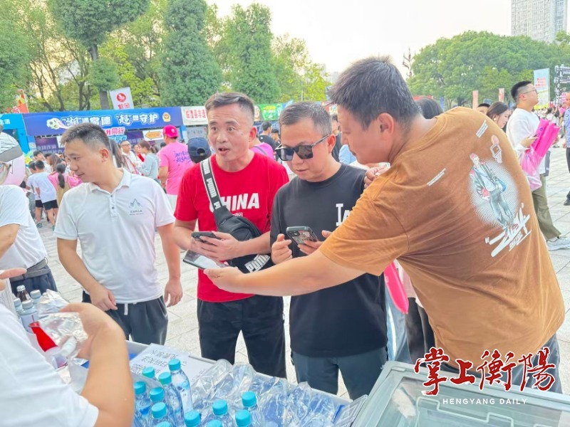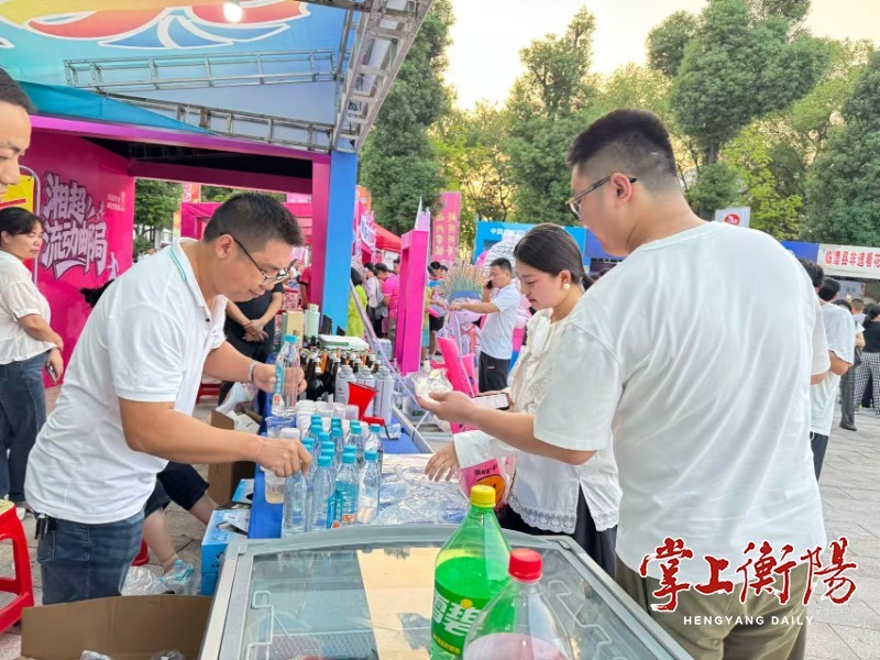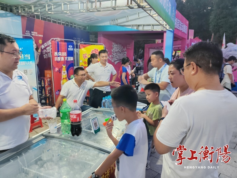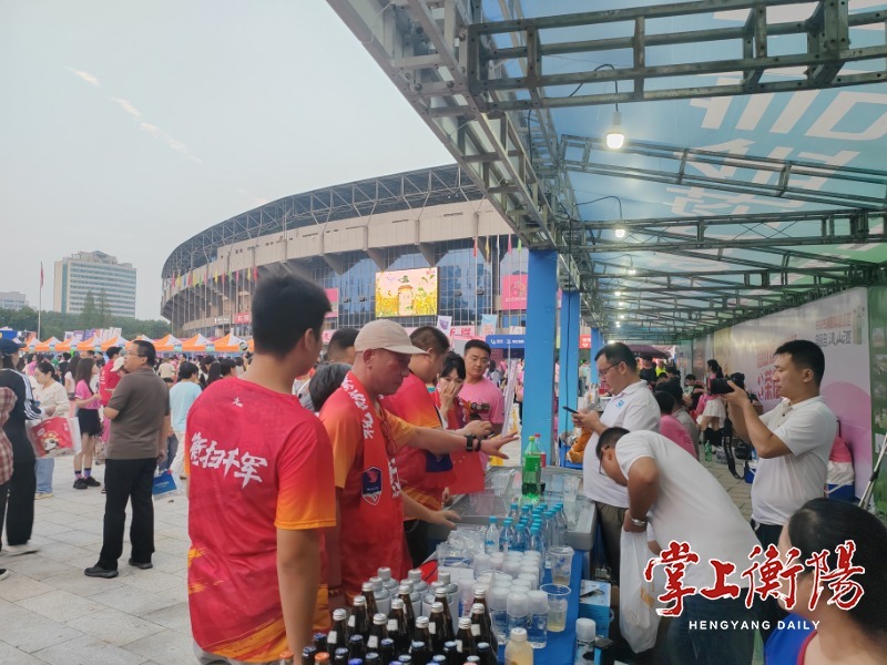 “衡阳好物”展区位于常德市体育运动中心西门,靠着网红效应和实际需求,湖南中汇食品的“辣椒冰激凌”“冰杯”、湖南巨麓峰矿泉水等展区前人流络绎不绝;燕京啤酒与酃酃酒聚焦“酒香引客”,现场提供不同口味的米酒、啤酒和饮料供球迷免费品尝,吸引大量球迷驻足品鉴、下单。