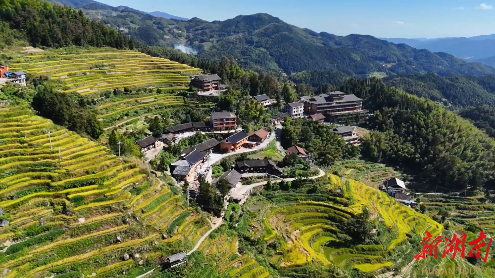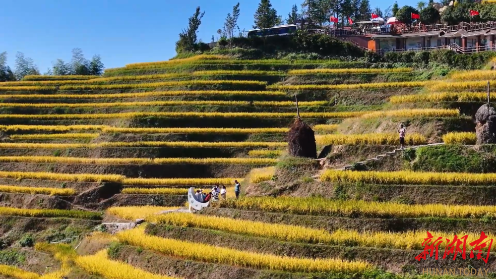 进入十月,位于湖南省新化县的紫鹊界梯田景区迎来最佳观赏期。梯田之上,稻穗金黄,稻香四溢,游人如织。