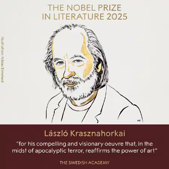 瑞典斯德哥尔摩当地时间2025年10月9日13:00(北京时间19:00),瑞典学院将2025年诺贝尔文学奖颁给了匈牙利作家拉斯洛·卡撒兹纳霍凯。