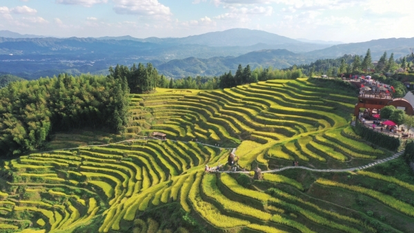 10月7日,新化县紫鹊界梯田稻浪翻滚、稻香四溢,吸引众多游客前来打卡。