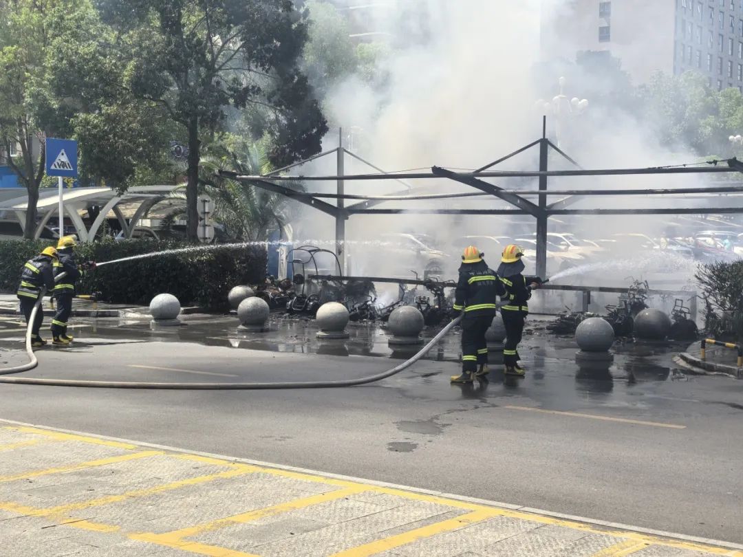 今年7月,上海崇明区翠竹路某小区内一电动自行车停车棚突发火情。消防员接警后立即到场展开扑救,火灾未对周围居民楼造成影响,但棚内停放的30余辆电动自行车,不同程度烧毁烧损。